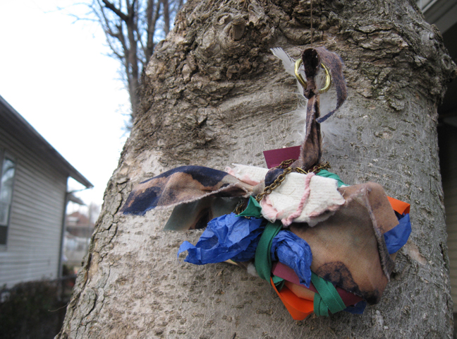 Pictured above is my experiment with the idea. I found a fragment of brick in my garden and wrapped it in fabric scraps and paper, some with a brief reflection about the brick written on them. The brick is a reminder of structures that were part of my backyard when the house was built more than 100 years ago. I tied the bundle to the magnolia tree in my yard.