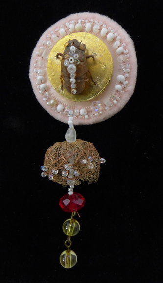 Finally one turned up on one of my apple trees so I could experiment with a different kind of husk. Other materials in this piece are a vintage powder puff, beads, cast off silk thread, old jewelry bits, and a gold-leafed button.