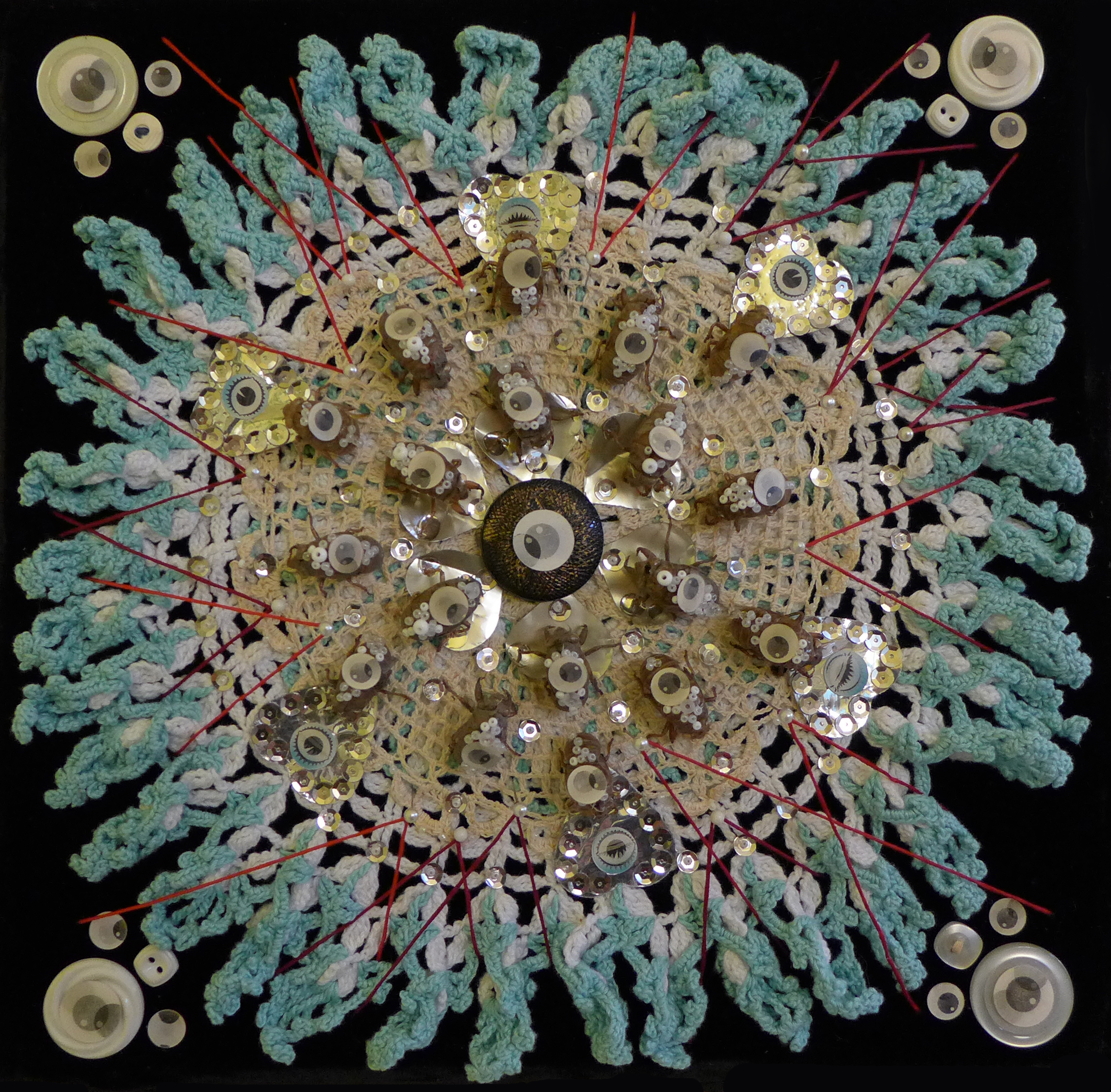 I’d wanted to make a piece for a local recycled art show, so I used the cicadas as an inspiration, building a kind of mandala from them and some crazy lenticular eyes I’d picked up at the Visionary Art Museum in Baltimore. Throw in some old buttons, wedding confetti I picked off the ground in Germany, old doilies, beads, pins, sequins, and thread, and it’s a writhing dance of empty shells and eyeballs.