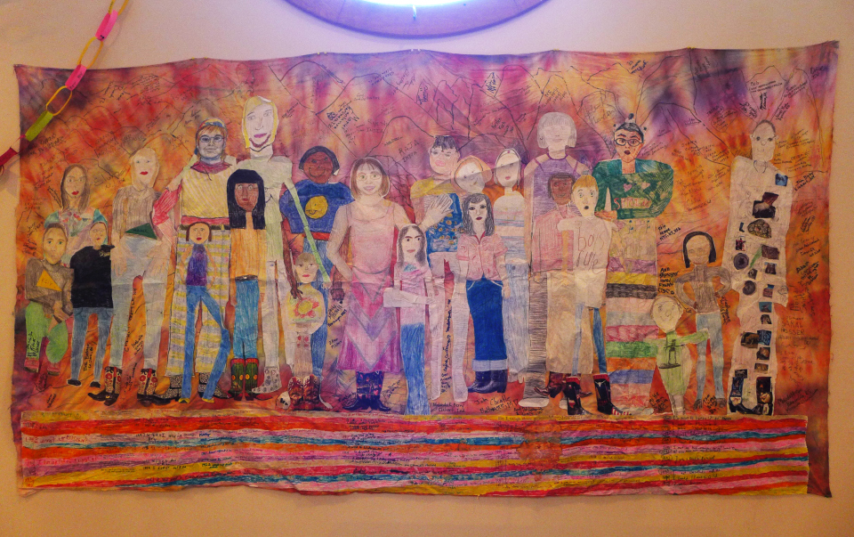 This is the giant banner that was made in Patchwork Central’s after school art program in 2000. The children created large self portraits which were cut out and pasted onto a cloth that they had painted to represent the Grand Canyon. At the bottom of the banner is a “strata study” detailing significant events in the children’s lives for each year of their life, much in the way the layers of rock at the Grand Canyon (and elsewhere) have recorded their own chronological record.