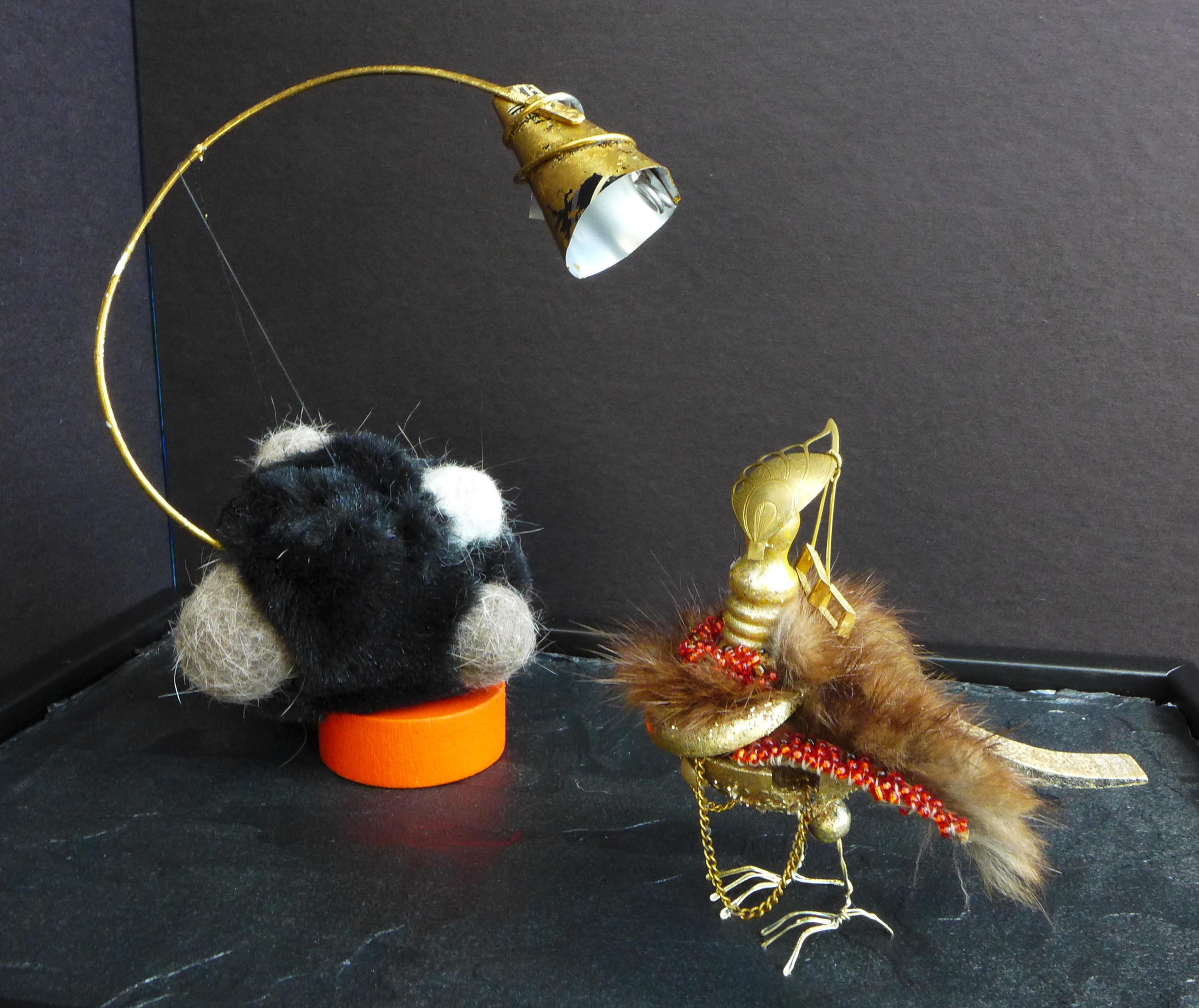 Materials: A stuffed cat, my real cat, bra under wire, pop can, toy and game pieces, old jewelry, fur coat, pop can, glitter, paint, thread