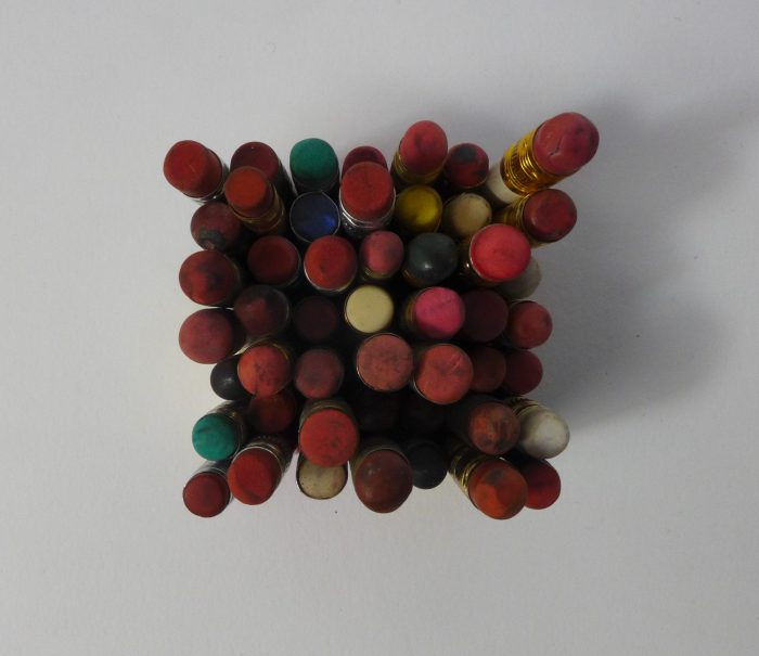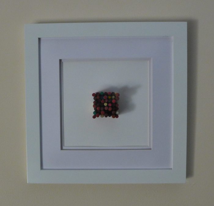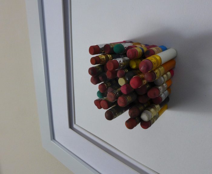 My piece is called “In Error”. It is a 2″ square of pencils cut to different lengths but none over 2″. They are arranged with the erasers pointed out.