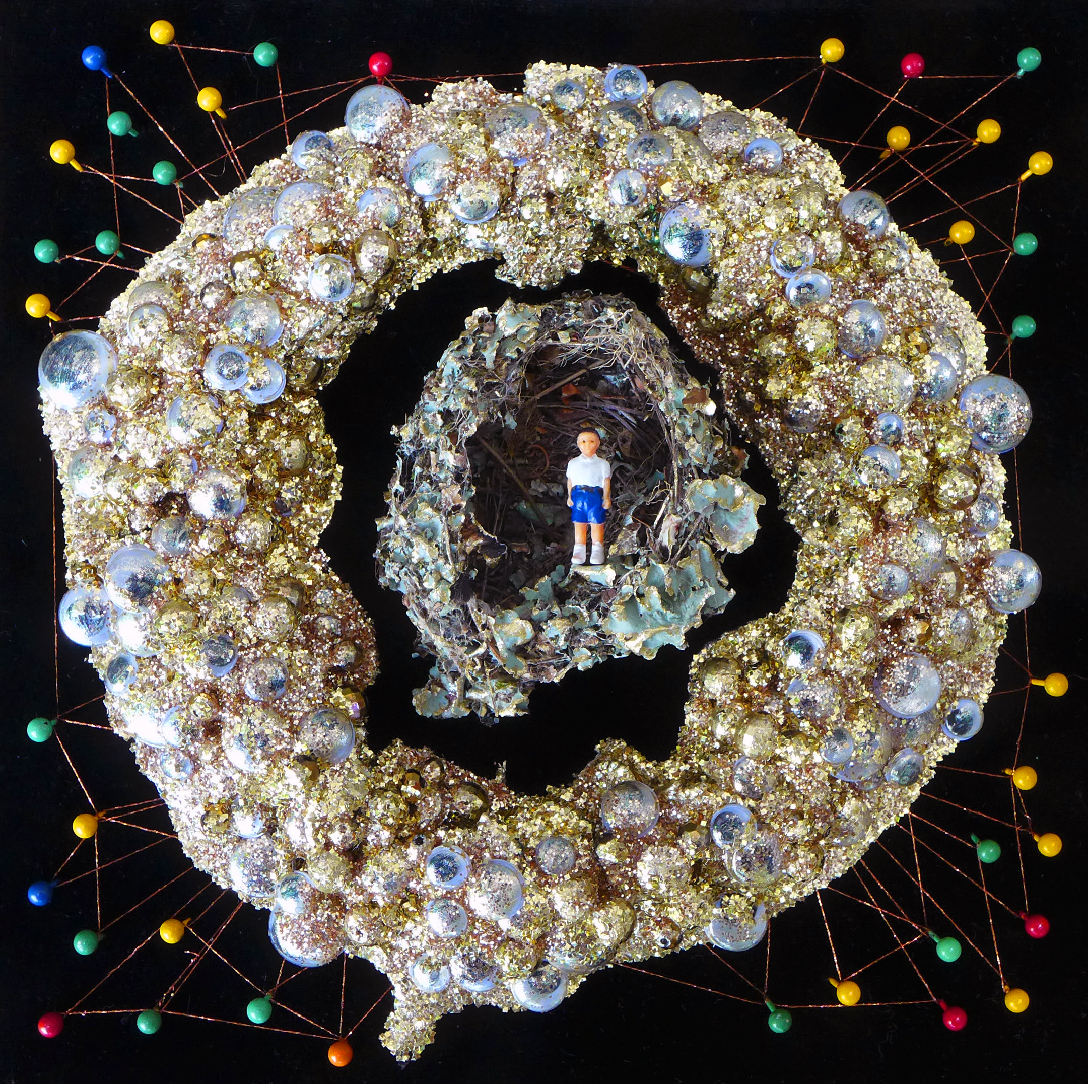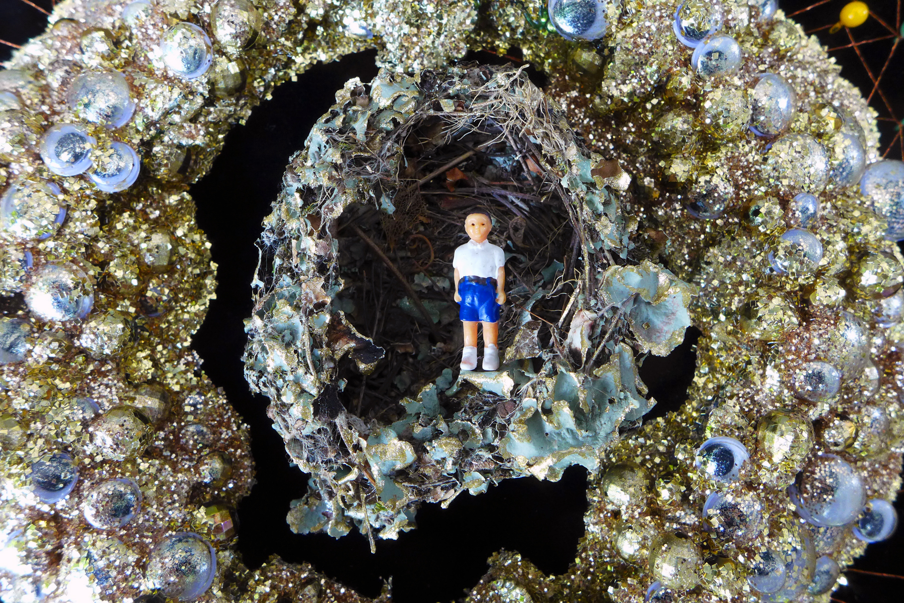 The centerpiece is a beautiful little nest that I found on the ground last fall. I created a mass of glitter and googly eyes to surround it. Someone remarked that the glittery circle was reminiscent of Ezekiel’s vision of a wheel covered in eyes, which I liked. The inspiration for the piece hadn’t been the Bible verse, but I decided to make a reference to the folk song “Ezekiel Saw the Wheel” by titling the piece “Way Up in the Middle of the Air”.