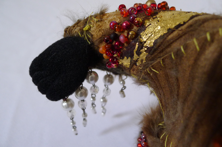 Finally one turned up on one of my apple trees so I could experiment with a different kind of husk. Other materials in this piece are a vintage powder puff, beads, cast off silk thread, old jewelry bits, and a gold-leafed button.